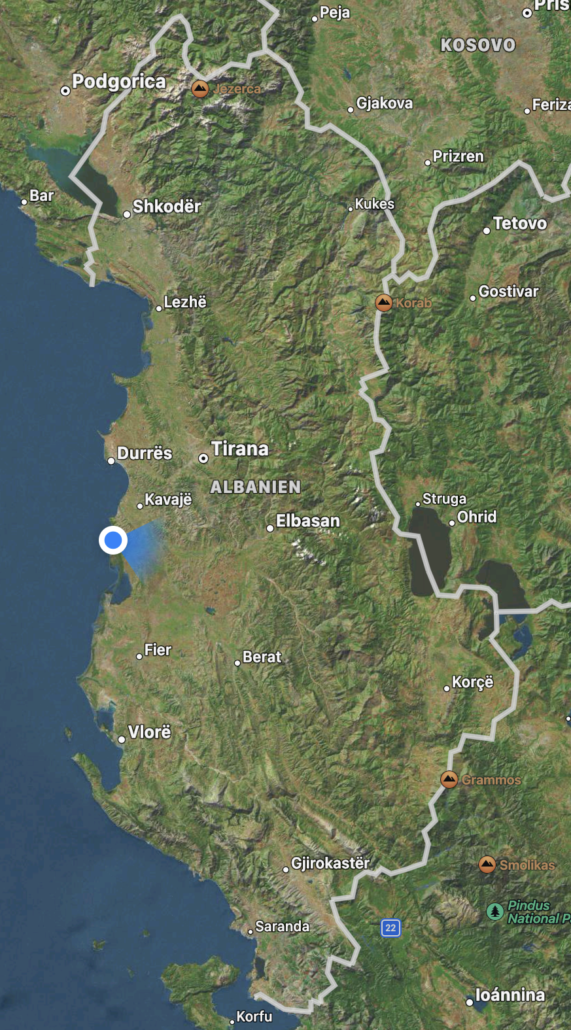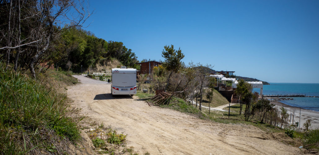In den nächsten Tagen wollen wir an der Adriaküste weiter nach Süden reisen. Wieder vorbei an Durres ist unser nächstes Ziel nach ca. 90 km Spille Beach mit seinem kilometerlangen Sandstrand. Auch hier hat die Sommersaison noch nicht begonnen und wir sind fast alleine hier.