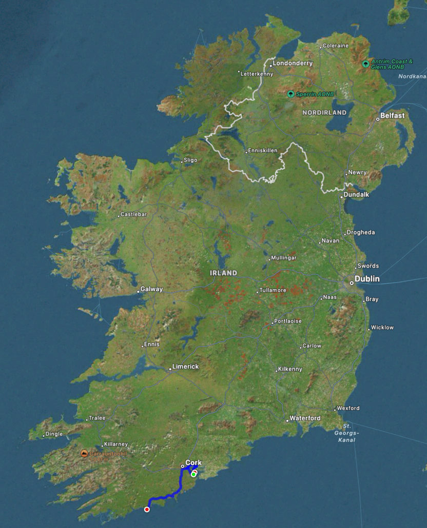 Unser erstes Ziel ist die kleine geschichtsträchtige Stadt Cobh. Von hier sind von 1845 bis 1960 etwas 2,5 Millionen Iren nach Kanada und Amerika ausgewandert, um der Hungersnot im eigenen Land zu entkommen. Und auch von hier ist die Titanic 1912 zu ihrer letzten Fahrt aufgebrochen. Wir übernachten direkt an der Kaimauer, von der aus die Schiffe damals abgelegt haben.