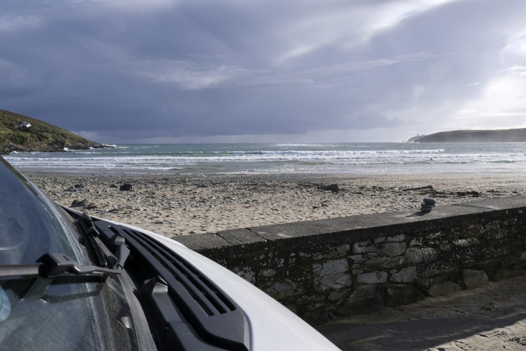 Jeder Irlandreisende träumt nicht nur von Pubs, Guinness und irischer Musik sondern auch von Traumstränden an den Buchten zwischen der schroffen Küste. Und an so einem Traumstrand stehen wir heute. Nach angenehmer Nachmittagssonne hat der Wetterbericht jetzt Sturm vorhergesagt und mit steigender Flut rollen auch schon ordentliche Wellen heran. Aber bei Meeresrauschen soll man ja bekanntlich besonders gut einschlafen können …