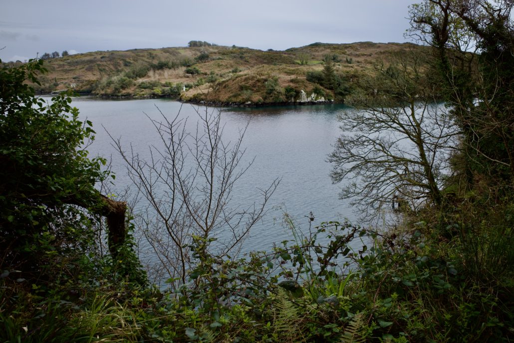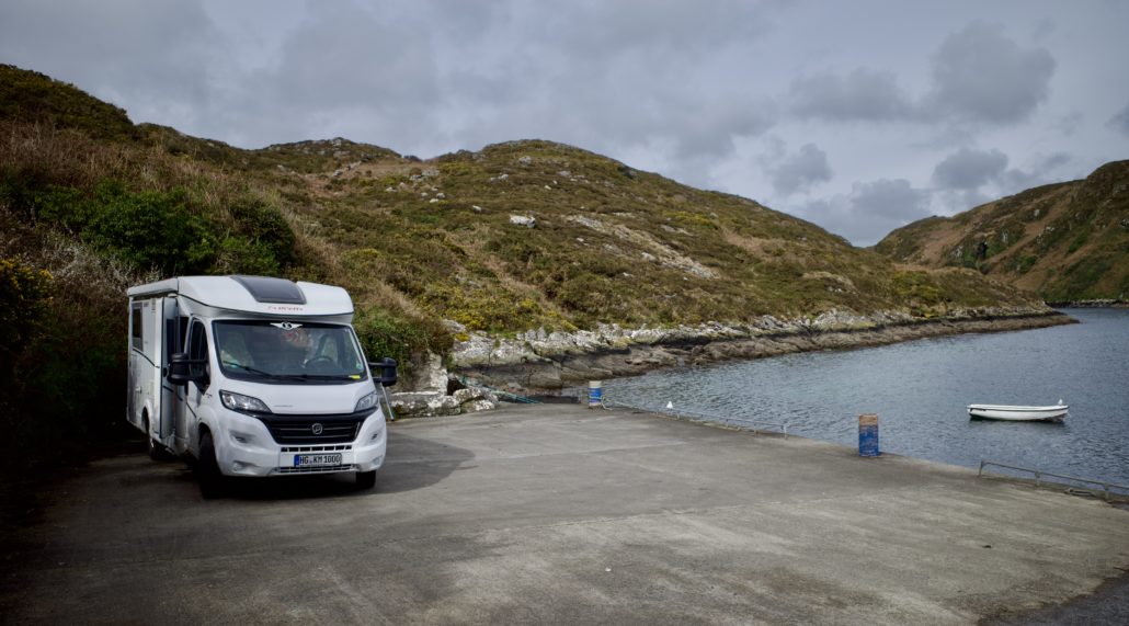 Eine kurze Etappe weiter auf unserer Route gelangen wir zum Lough Hyne, einem wunderschön gelegenen See, der eine Verbindung zum Meer hat und von üppiger Vegetation umgeben ist. Ganz versteckt und über einen mit unserem Camper gerade noch befahrbaren Weg kommen wir zu einer kleinen Anlegestelle für Fischerboote, wo wir heute Nacht ganz alleine sind