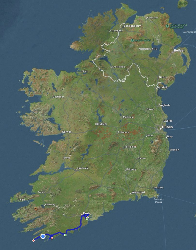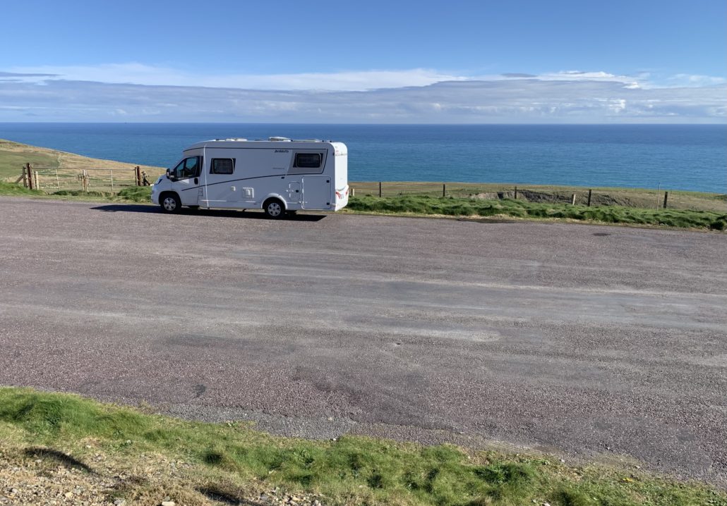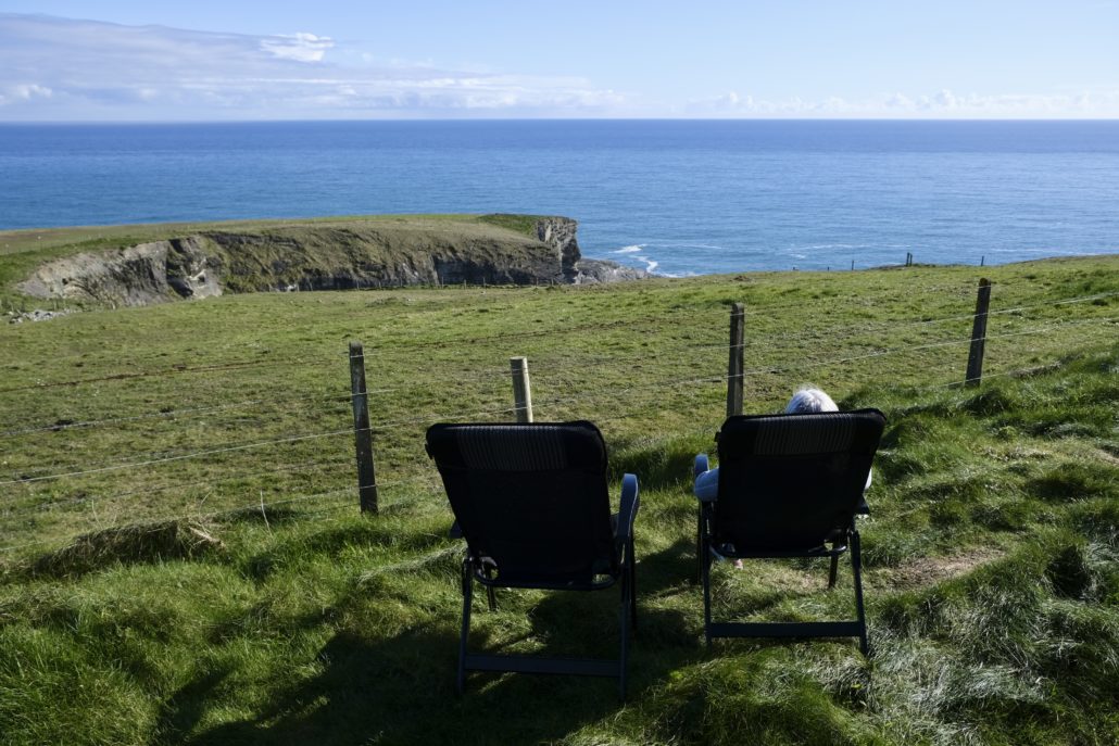 Die Landstraßen, über die wir im Moment fahren, sind sehr schlecht. Eine echte Herausforderung für Mensch und Material und wir müssen wohl leider davon ausgehen, dass das so bleiben wird. Durchgerüttelt erreichen wir die Landzunge Mizen Head. Es gibt dort eine spektakuläre Brücke zwischen den Klippen, die über ein Besucherzentrum zu erreichen ist. Das Gebäude ist aber wegen Bauarbeiten geschlossen, also keine Brücke und keine Blicke/Fotos auf die Klippen von Mizen Head. Dafür sitzen wir in der Nachmittagssonne und schauen auf den Atlantik und lassen den Tag ausklingen.