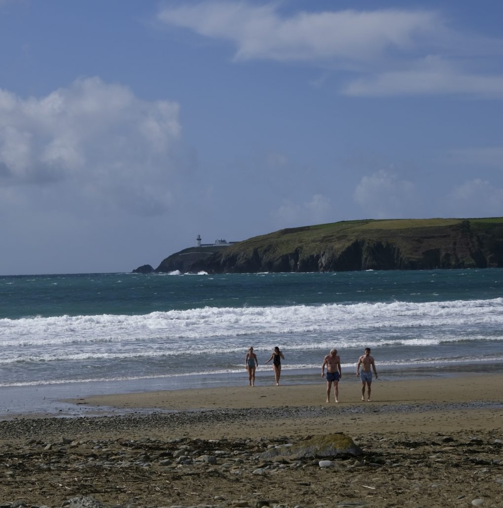 Die Iren haben ein sehr eigenes Verhältnis zu Kälte. Während bei uns im Camper die Heizung läuft, laufen sie schon jetzt – Ende März – teilweise mit kurzer Hose herum. Und eiskaltes Atlantikwasser scheint eine hohe Anziehungskraft zu haben. Mit weiten Badeumhängen gehen sie, teilweise ganze Gruppen, zum Schwimmen in den eiskalten Atlantik. Ist gesund, sagen sie.