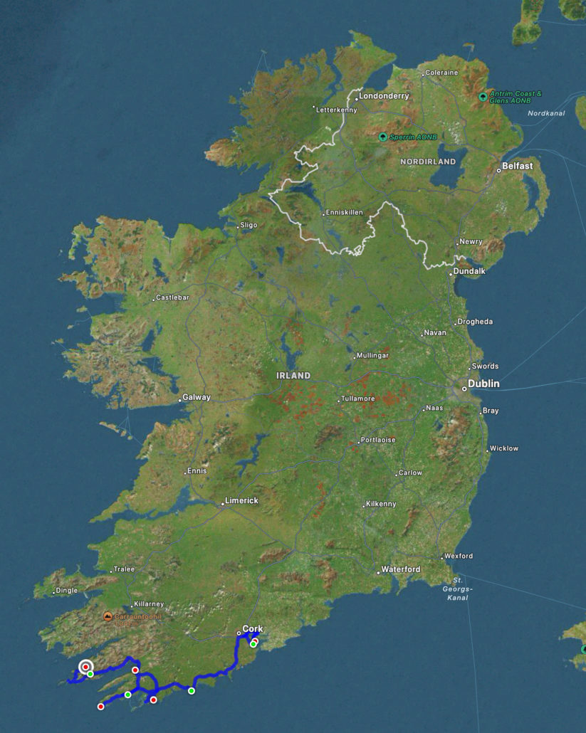 Die Nacht an der Landspitze von Mizen Head war nicht gut. Zusammen mit einem englischen Camper standen wir dort ganz alleine und um drei Uhr nachts kam ein Auto, stellte sich mit voll aufgedrehter Musik dicht hinter unseren Camper und der Typ fuchtelte mit einer langen Stange herum. Nach etwa einer Stunde fuhr er dann wieder davon. Keine Ahnung, was der vor hatte, aber es war ein mulmiges Gefühl. Zusammen mit dem anderen Camper haben wir diesen ungastlichen Ort noch in der Nacht verlassen und uns ein Plätzchen in einem kleinen Hafenstädtchen gesucht. Alles gut, aber solche Abenteuer brauchen wir nicht.