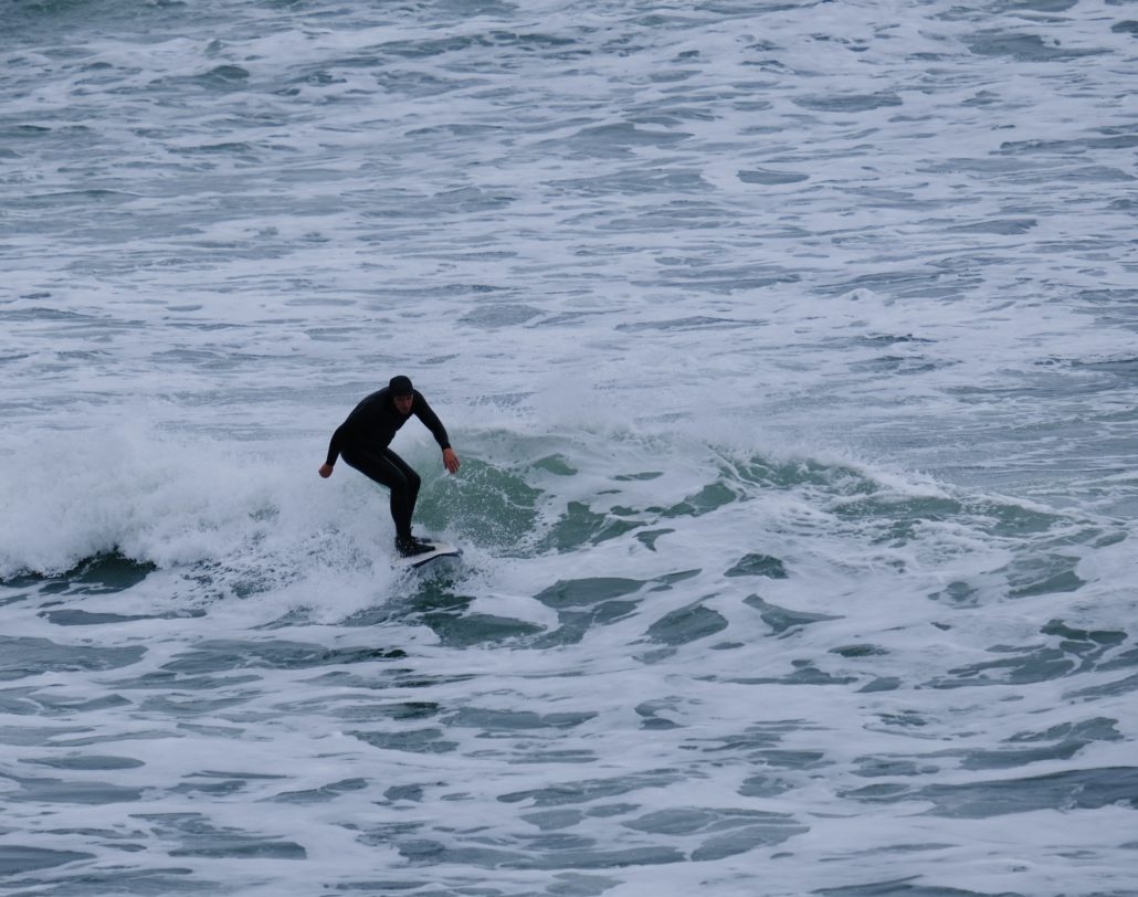 Immer wieder kommen wir an kleinen Buchten vorbei, wo die Brandung gegen die schroffen Felsen kracht und sich unerschrockene Surfer auspowern.