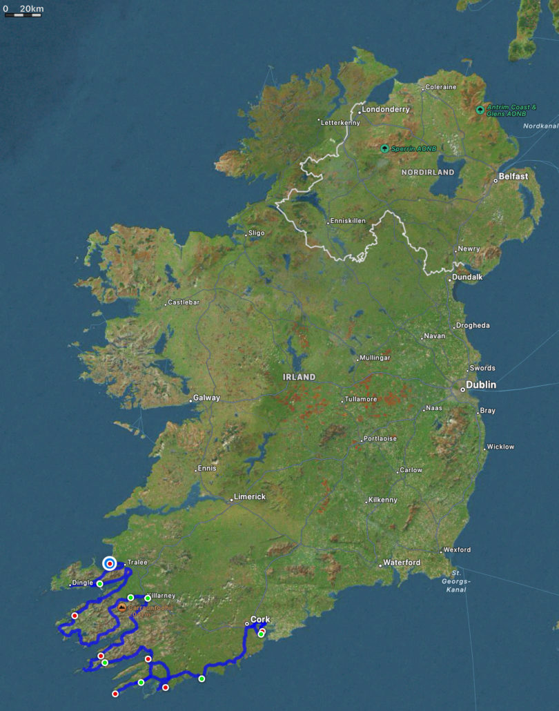 Auf unserem Weg weiter nach Norden haben wir uns heute einen außergewöhnlichen Übernachtungsplatz gesucht. Bei dem kleinen Städtchen Fenit gibt es eine Marina, die über eine lange Seebrücke zu erreichen ist. Wir stehen dort von Wasser umgeben … mal wieder bei Regen und starkem Wind.