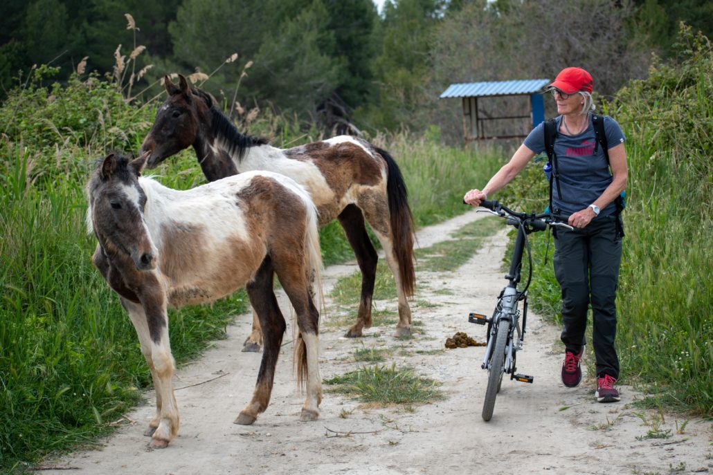 Die weitläufige Lagunenlandschaft liegt zwischen zwei Flußmündungen, die durch einen bewaldeten Dünenstreifen vom offenen Meer getrennt ist. In der Lagune leben viele seltene Wasservögel, u.a. Krauskopfpelikane. Mit dem Fahrrad geht´s über sandige Wege durch die eindrucksvolle Landschaft. Mit den Falträdern ist das ziemlich beschwerlich – mit unseren Mountainbikes wäre es ein Kinderspiel! Wir begegnen einer Herde freilaufender Pferde und Millionen Mücken – die beschriebenen Wasservögel sind allerdings nicht zu entdecken.