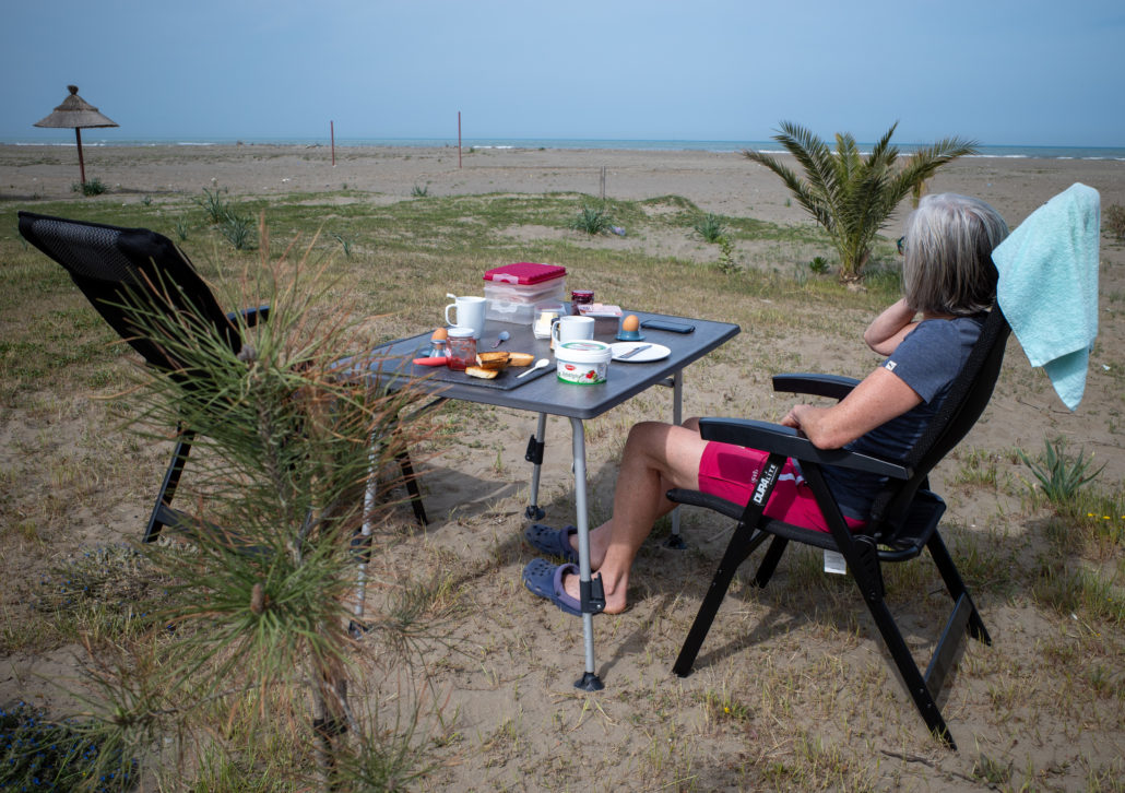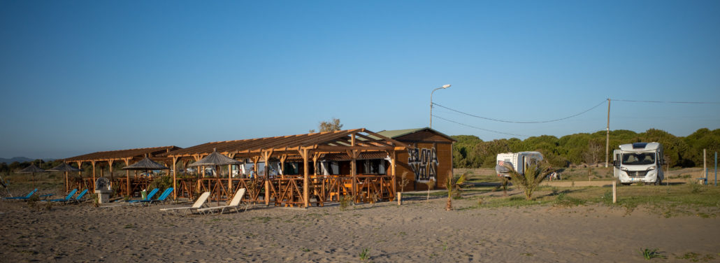 Unser nächster Stellplatz liegt Luftlinie nur 3 km südlich bei einem Restaurant direkt am Strand. Mit dem Camper sind es aber 10 km über eine Buckelpiste – Fahrzeit 40 Minuten! Zu unserer Überraschung treffen wir hier erstmals auf andere Camper – Deutsche und Franzosen. Auch hier zeigt sich wieder die besondere albanische Gastfreundschaft, für ein Geburtstagskind unter den Gästen wird eine Torte für alle aufgetischt.