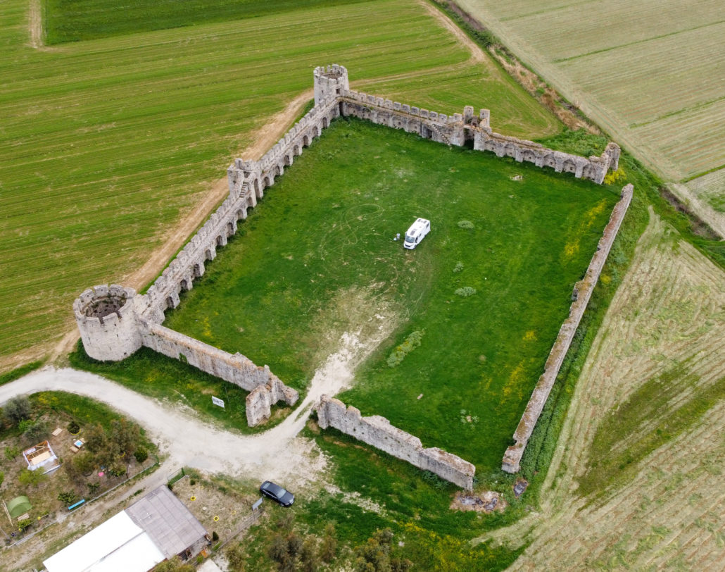 Nachdem wir unseren Strand-Stellplatz am nächsten Tag verlassen haben, taucht nach kurzer Fahrt wie aus dem Nichts ein rechteckiger Bau vor uns auf – die Festung Bashtova, von der lediglich die hohen Mauern mit Wehrtürmen und Zinnen erhalten sind. Der leere Innenraum der Festungsanlage ist eine tolle Kulisse für einen Fotostop.
