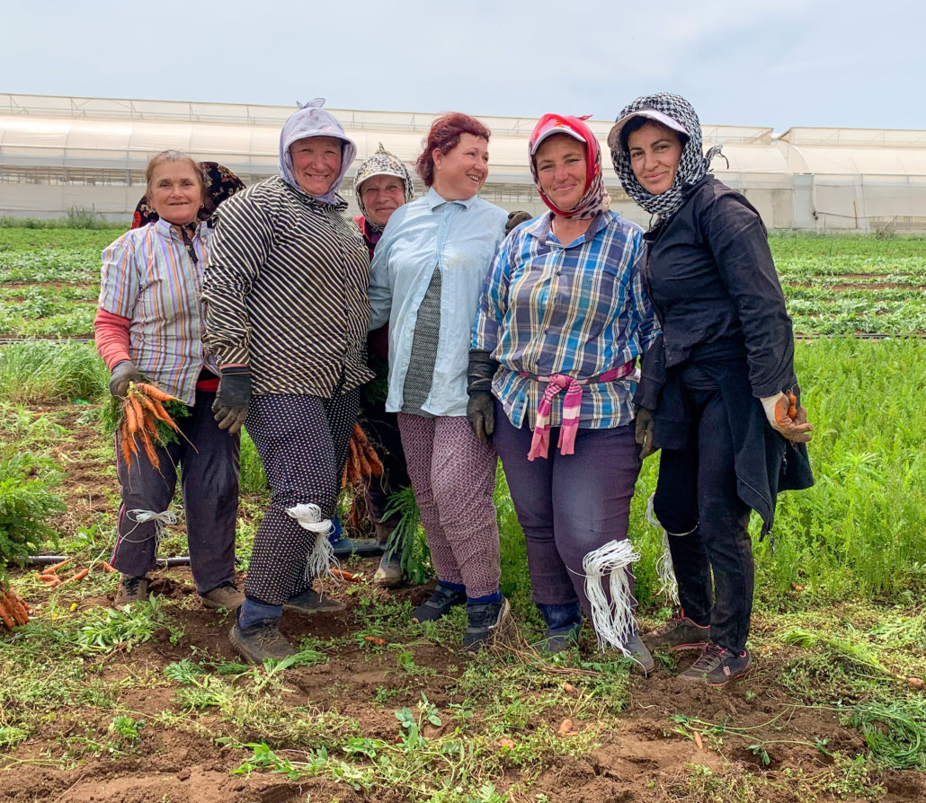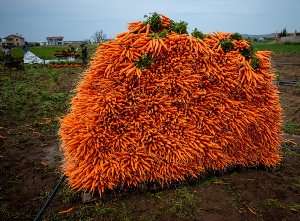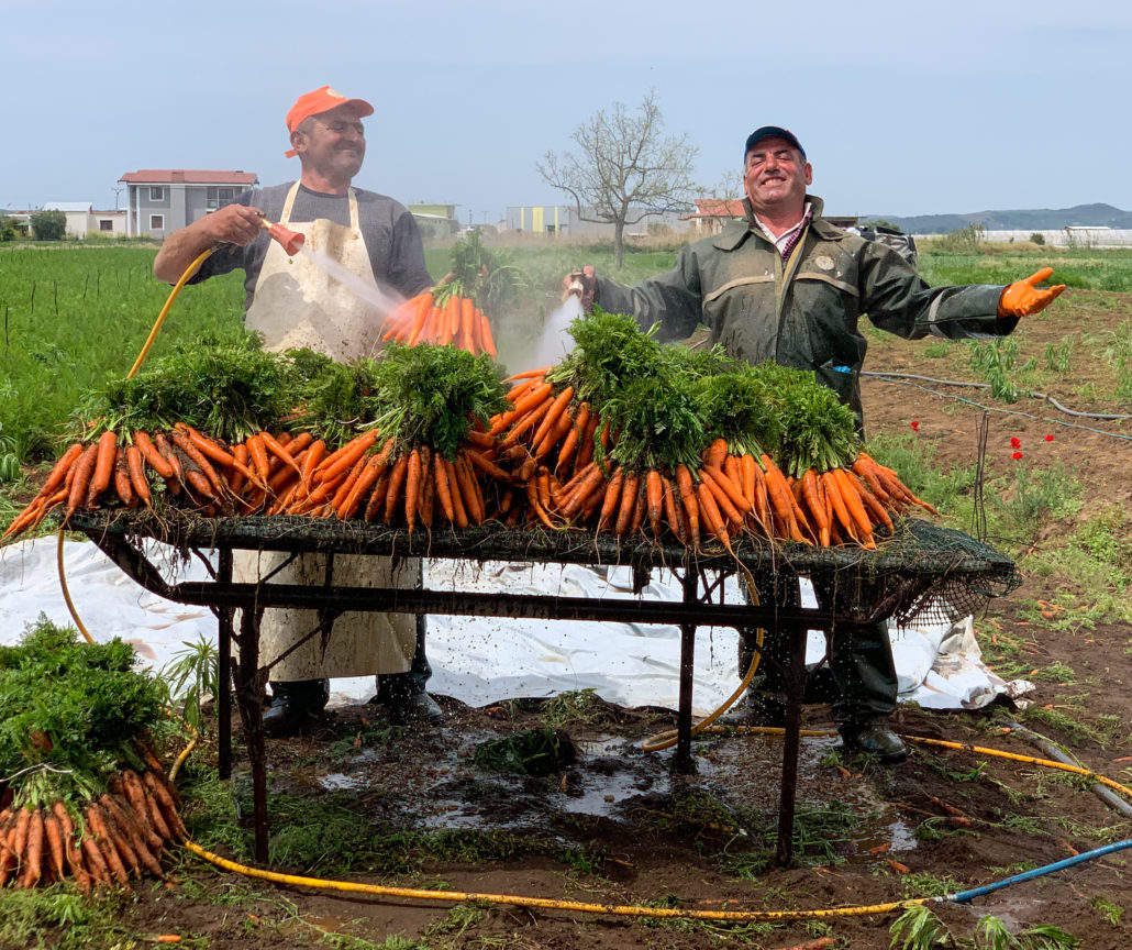 Auf der Weiterfahrt Richtung Süden zur größten Küstenlagune Albaniens – Karavasta-Lagune – kommen wir durch ein Gebiet mit intensivem Gemüseanbau. Hier werden gerade Karotten geerntet.Solche Berge an Karotten haben wir noch nie gesehen! Die Erntehelfer lassen sich gerne bei der Arbeit fotografieren.