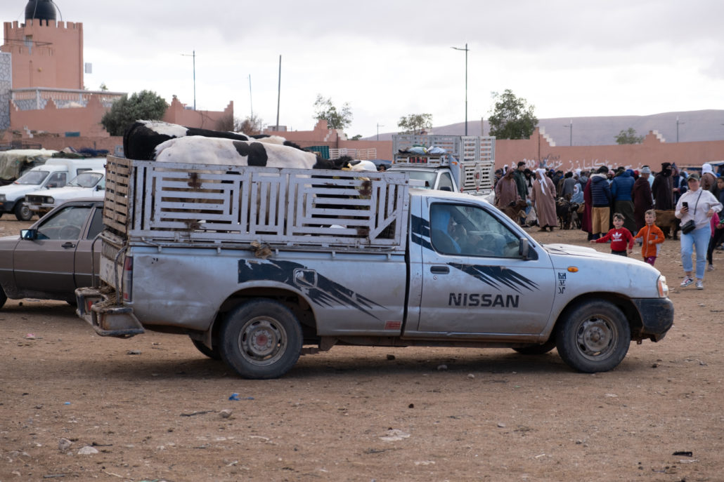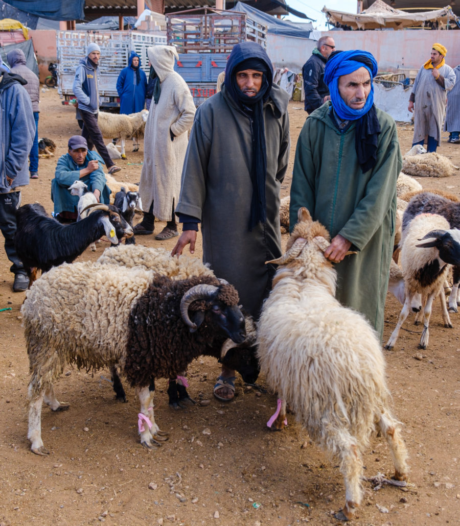 Einmal in der Woche gibt es in Guelmim einen großen Vieh- und Gemüsemarkt, den wir uns natürlich nicht entgehen lassen wollen. Menschengewimmel und Lautsprecherstimmen ziehen uns gleich nach dem Frühstück auf den Souc. Der Tiermarkt ist eine für uns ungewöhnliche Szenerie und nichts für schwache Nerven und Tierliebhaber. Die Tiere können einem schon leid tun. Wir kommen das erste Mal in Berührung mit Kamelen.